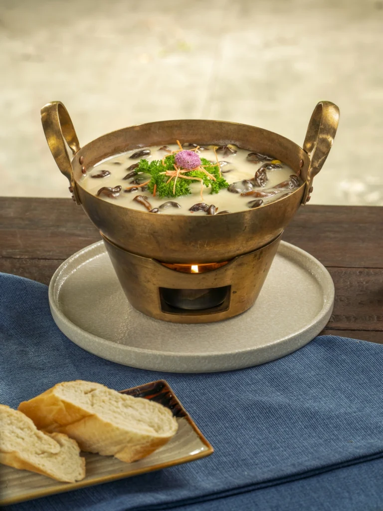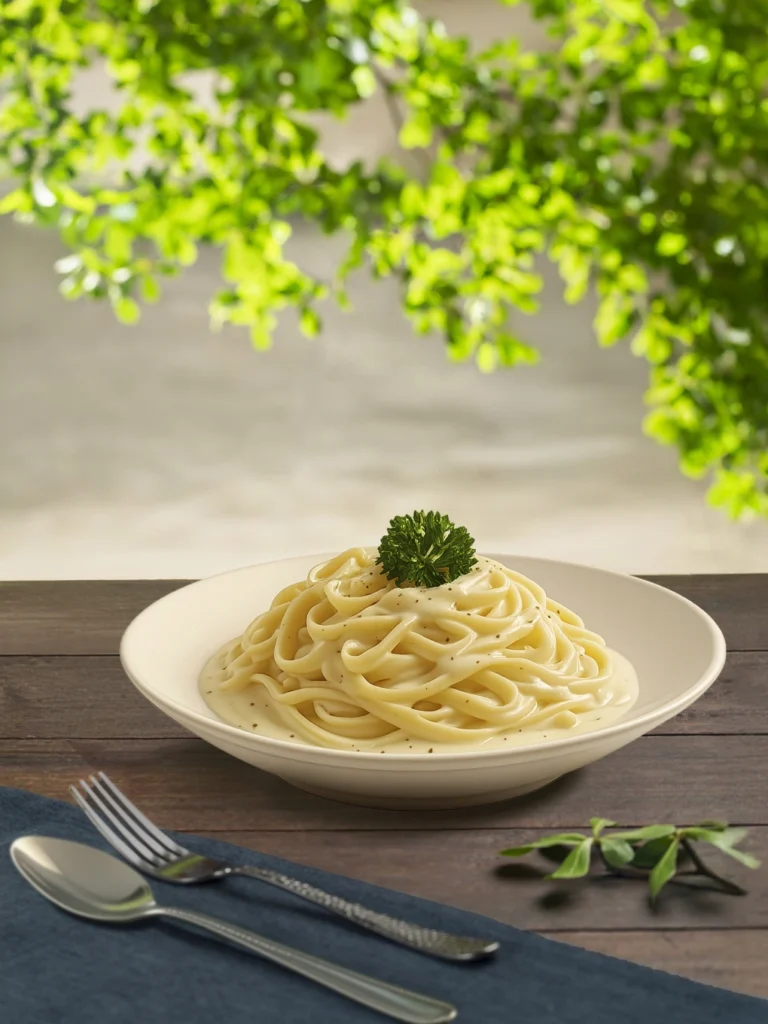 Điểm lạ: bỏ trứng và thịt xông khói, dùng nấm xào đậm vị; sữa đặc thuần chay + sữa hạt tạo kết cấu kem mượt, men dinh dưỡng cho hậu vị phô mai.