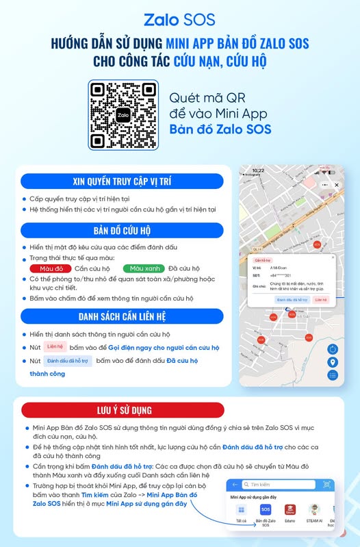Trên ứng dụng Zalo, tính năng Zalo SOS được xây dựng như một kênh liên lạc khẩn cấp khi xảy ra thiên tai, sự cố. Mới đây, Zalo SOS bổ sung bản đồ cứu hộ khẩn cấp, cho phép hiển thị trực quan các điểm cần hỗ trợ trên bản đồ số, giúp việc điều phối lực lượng và triển khai cứu nạn, cứu trợ diễn ra có tổ chức và hiệu quả hơn.