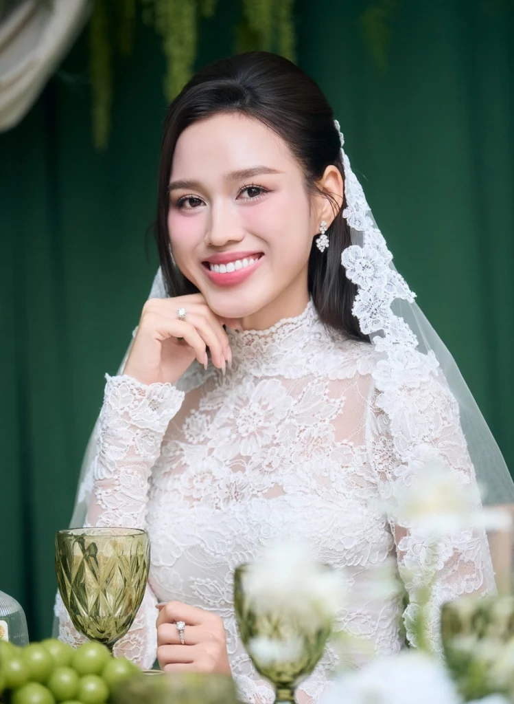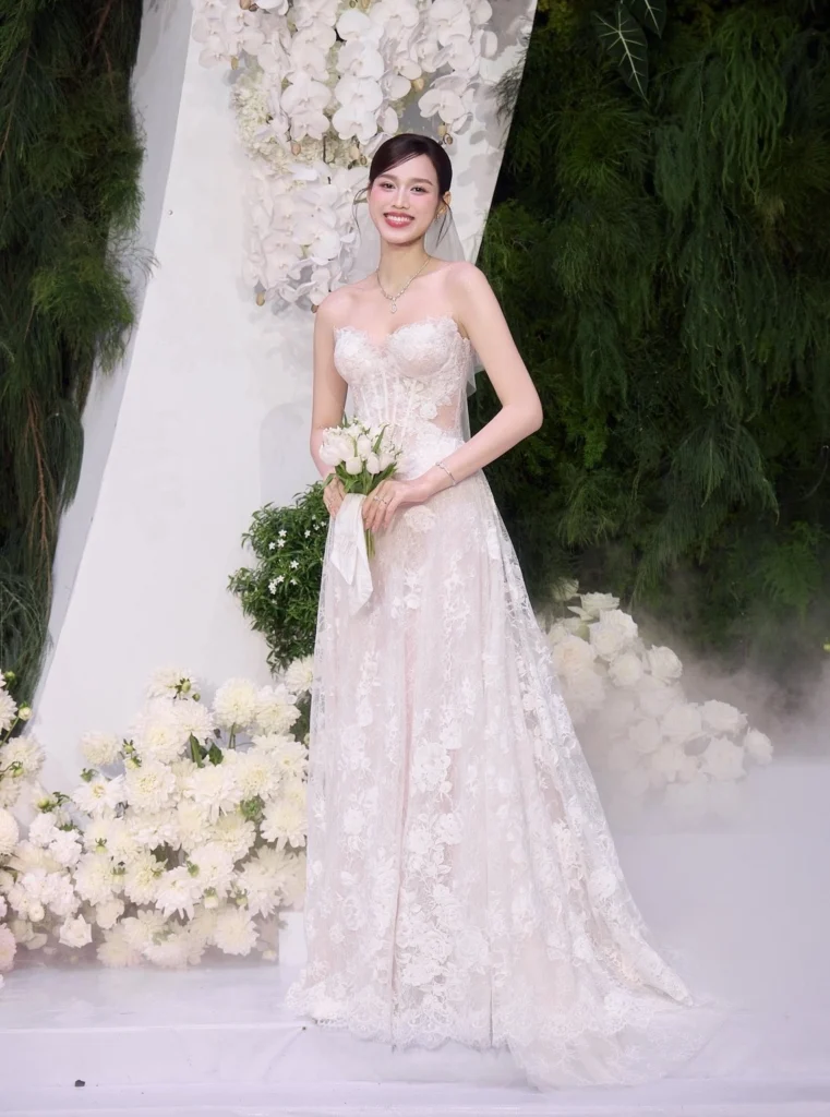 Trong phần giao lưu, chào hỏi quan khách, hoa hậu thay chiếc váy chữ A cúp ngực bằng ren hoa. Phom váy này giúp di chuyển thoải mái, giữ hình ảnh nhẹ nhàng, nữ tính khi cô dâu di chuyển giữa không gian đông người để trò chuyện và chụp ảnh cùng gia đình, bạn bè.