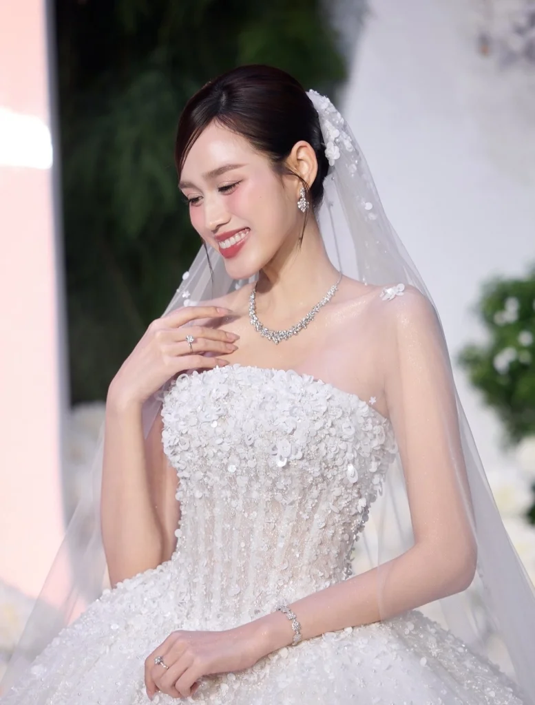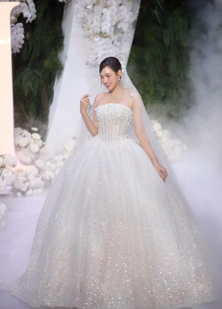 Khi bước vào nghi thức chính, người đẹp thay sang đầm công chúa quây ngực mang tên “The Bloom of Light”, lấy ý tưởng từ những tia nắng đầu ngày len qua màn sương. Bộ váy do Trà Linh và Việt Trinh thực hiện, sử dụng corset 10 lớp ép nhiệt để ôm sát thân trên. Chất liệu metallic tulle, sequin và voan lưới phối hợp tạo hiệu ứng phản chiếu dịu, chuyển sắc theo chuyển động. Toàn bộ bề mặt phủ hàng nghìn cụm hoa nhỏ sắp xếp theo bố cục lan tỏa; kỹ thuật đính kết nhiều lớp giúp mỗi bông hoa 3D nổi rõ nhờ những lớp tulle mảnh cắt laser và khâu tay tỉ mỉ. Dự án được năm thợ may và sáu nghệ nhân hoàn thành trong hai tháng, thể hiện mức độ đầu tư cho khoảnh khắc quan trọng nhất của buổi tối.