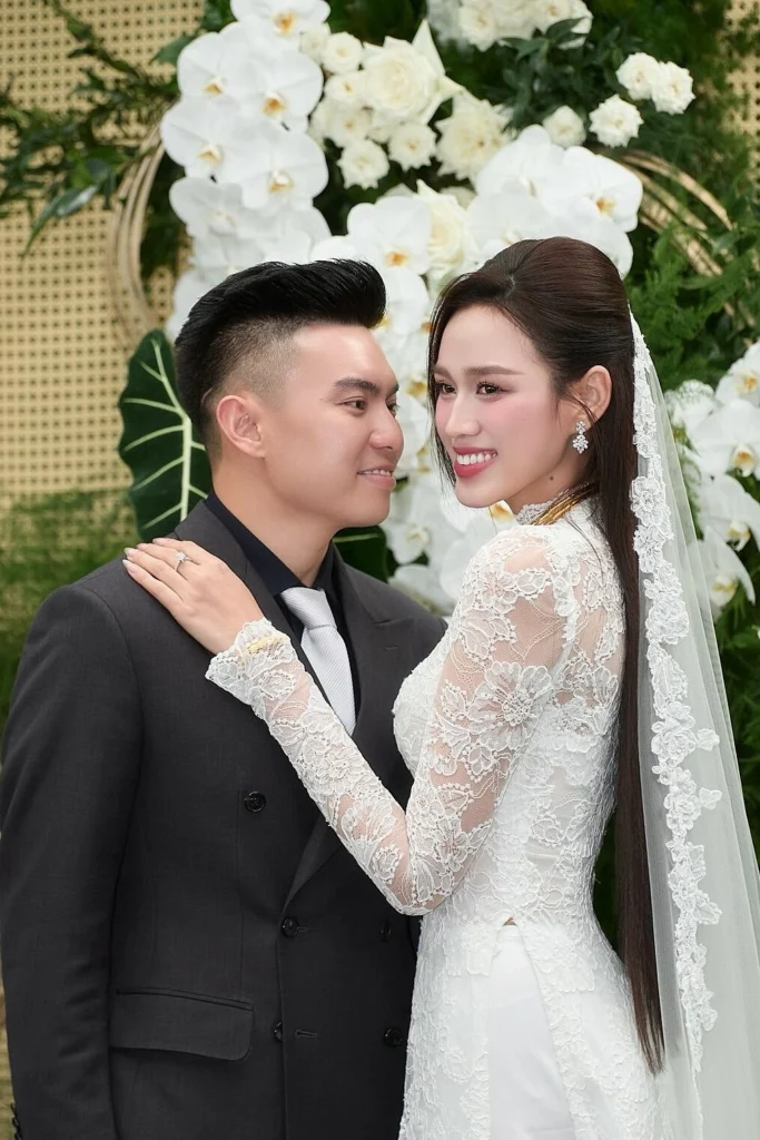 Ở nghi lễ buổi sáng cùng ngày tại Thanh Hóa, Đỗ Thị Hà mặc áo dài ren Pháp. Chi tiết thêu tay được hoàn thiện trong hơn một tuần, tạo bề mặt tinh tế nhưng vẫn giữ sự kín đáo theo tinh thần truyền thống. Sự chuyển đổi từ áo dài trong buổi sáng sang các dáng váy phương Tây vào buổi tối giúp tổng thể ngày cưới cân bằng giữa nét Việt và phong cách hiện đại.