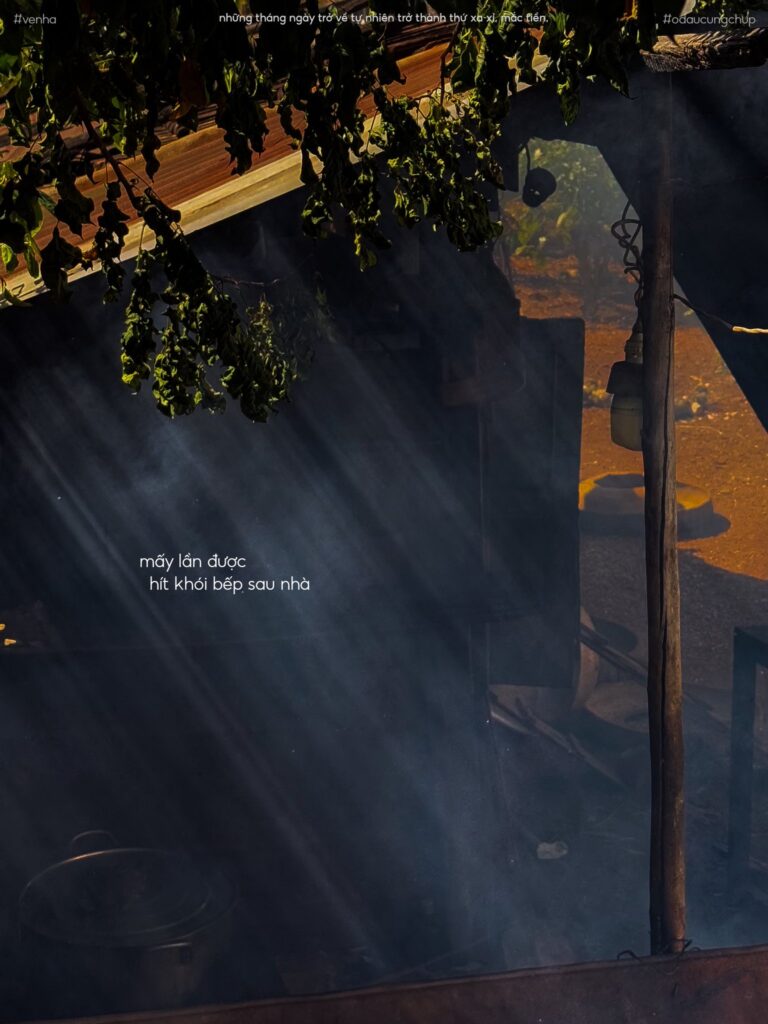 Tới lúc xếp đồ trở lên phố, con đường từ bếp ra ngõ bỗng dài hơn mọi khi. Cánh cổng vừa khép lại, bước chân nghe nặng như mang theo cả mùi khói bếp. Ba má đứng trông theo, bàn tay đưa lên che nắng mà thiệt ra che cái bùi ngùi trước mắt. Mình cười lớn cho ba má yên lòng, rồi quay đi, nghe tim rớp một cái như tờ lịch rơi khỏi móc. Bước lên xe, phố đón mình bằng bụi bặm, còn nhà tiễn mình bằng im lặng.