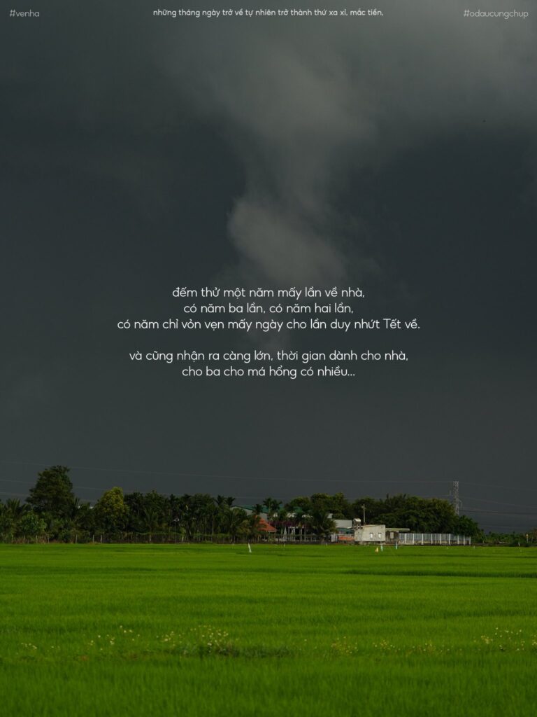 Đường về nhà lúc nào cũng ở đó, chỉ là lòng mình có ngoảnh lại hay không. Đếm thử một năm mấy lần về nhà, đừng để con số đứng hoài ở một chỗ. Guồng quay đời thì quay hoài, còn ba má đâu có đứng đợi mãi. Vậy nên, giữa bộn bề mưu sinh, ráng chừa một khoảng trống cho mái hiên, cho mùi cơm mới, cho tiếng gọi “con ơi” nghe qua tưởng bình thường mà ấm tới tận tim. Đừng để thương yêu chờ lâu, nghen.