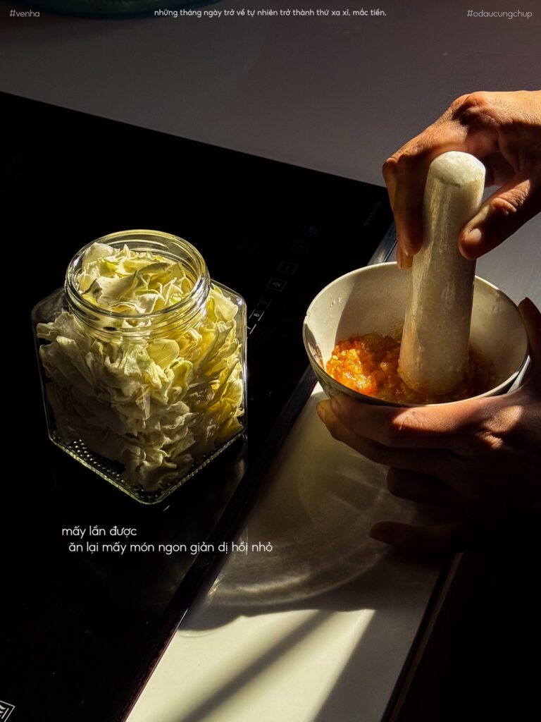 Có những thứ nhỏ xíu mà đi xa rồi mới thấy quý: cái mền cũ thơm nắng, cái ghế gỗ cọt kẹt, chén muối ớt trộn tỏi đập dập, trái ổi giòn ba hái sau vườn, miếng cá rô đồng chiên giòn chấm nước mắm me. Má rửa chén cứ liếc coi con có gắp đủ chưa, ba lục đục sửa cái bản lề cửa sắt kêu két két. Ngày xưa coi nhẹ như gió thoảng, bây giờ thấy giá trị như hũ mắm cá linh để tới vụ bông điên điển nở là khui ra ăn cho đã thèm.
