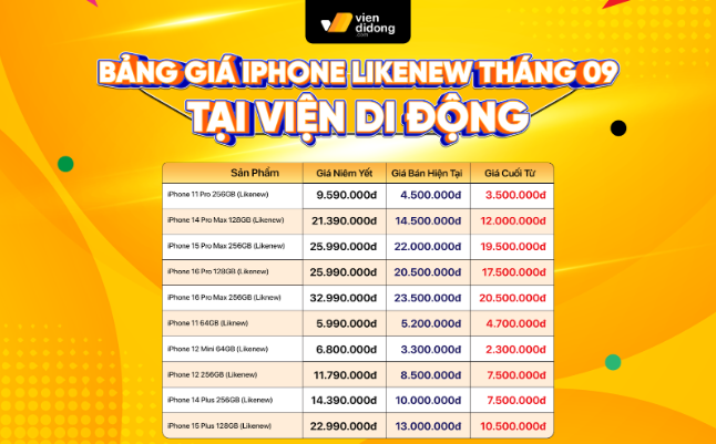 Bảng giá một số dòng iPhone cũ tháng 9 tại Viện Di Động.