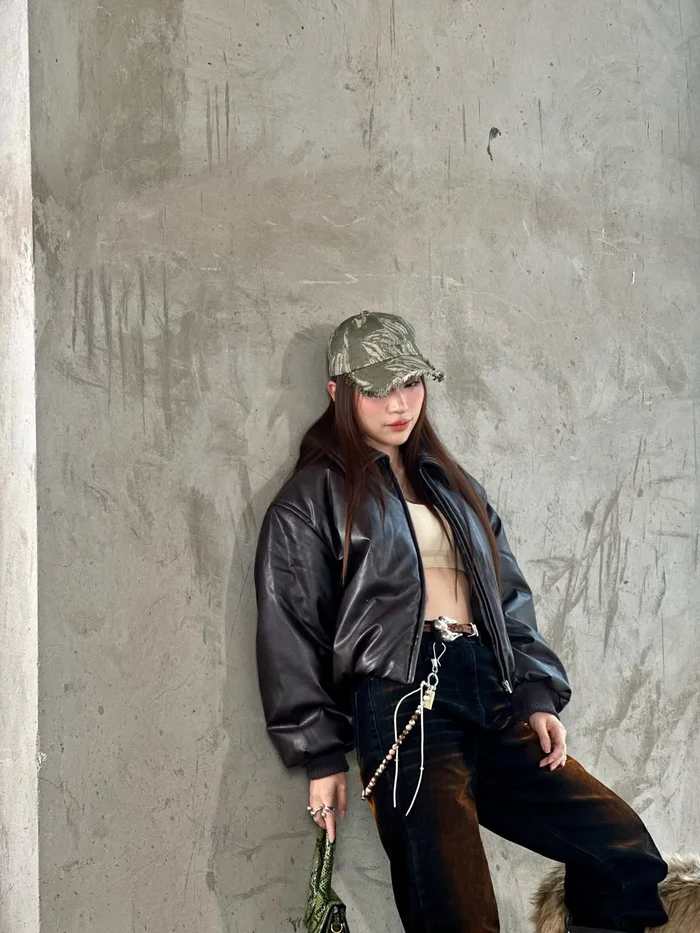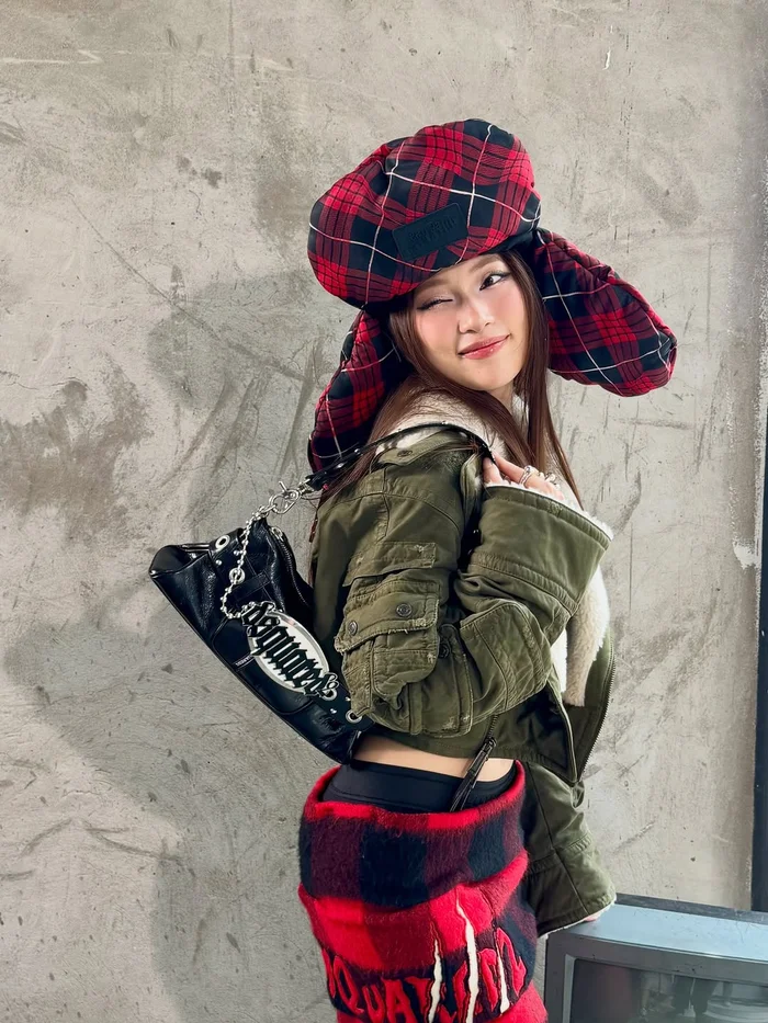 Trong những bức ảnh khác, Khánh Vy tiếp tục gây chú ý khi chuyển sang hướng phối đồ phóng khoáng hơn với áo khoác dáng rộng, đi kèm phụ kiện cá tính và mũ họa tiết. Tổng thể lần này gợi liên tưởng đến phong cách streetwear, tạo cảm giác trẻ trung và “nổi loạn” hơn so với nét dịu dàng thường thấy.