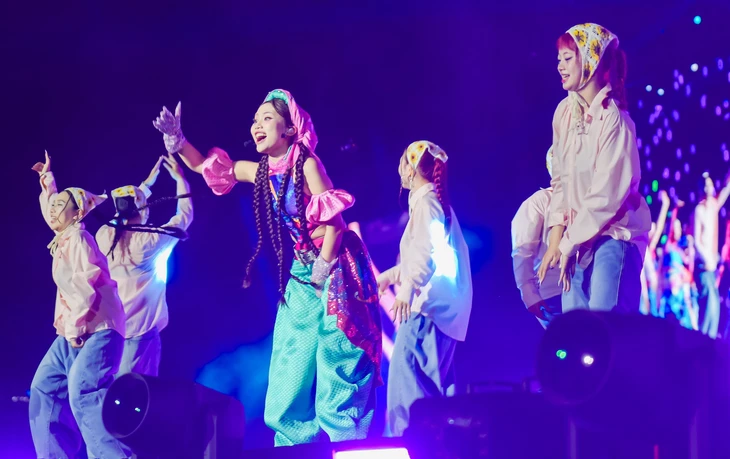 Phương Mỹ Chi là người cất tiếng cười đầu tiên cho khán phòng. Những câu bông đùa của Chi với Orange khiến khán giả “cười rũ” trước khi lao vào chuỗi tiết mục dày đặc. Khi Chi cất giọng ở “Duyên” rồi “Ếch ngoài đáy giếng”, không gian như vỡ tung: khán giả lắc lư, hát theo, thậm chí biến cả khối khán đài thành một dàn bè khổng lồ. Sự hoạt ngôn và ứng biến của Chi giúp phần giao đãi giữa các tiết mục thêm mượt mà, đúng tinh thần “em xinh” – xinh và biết kể chuyện.
