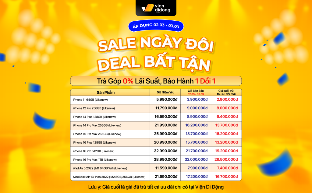 Đón đầu tâm lý này, hệ thống Viện Di Động sẽ diễn ra chương trình “Sale ngày đôi – Deal bất tận” từ 8h00 – 22h00 trong hai ngày 02/03 đến 03/03.