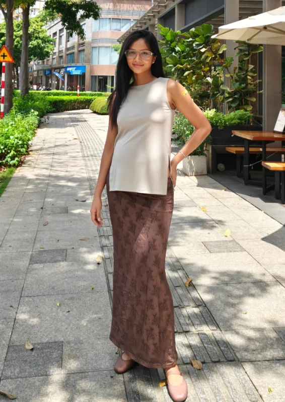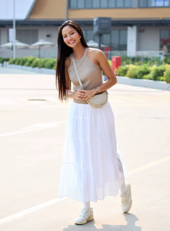 Bên cạnh đó, cô cũng hay phối áo ôm dáng gọn cùng chân váy maxi mềm rũ, hơi hướng boho casual. Sự kết hợp này mang đến vẻ phóng khoáng, bay bổng nhưng không kém phần thanh lịch. Chỉ cần thêm đôi sandal bệt hoặc dép quai mảnh, H’Hen Niê đã có một set đồ vừa thoải mái, vừa tôn dáng cho những ngày dạo phố hay gặp gỡ bạn bè.