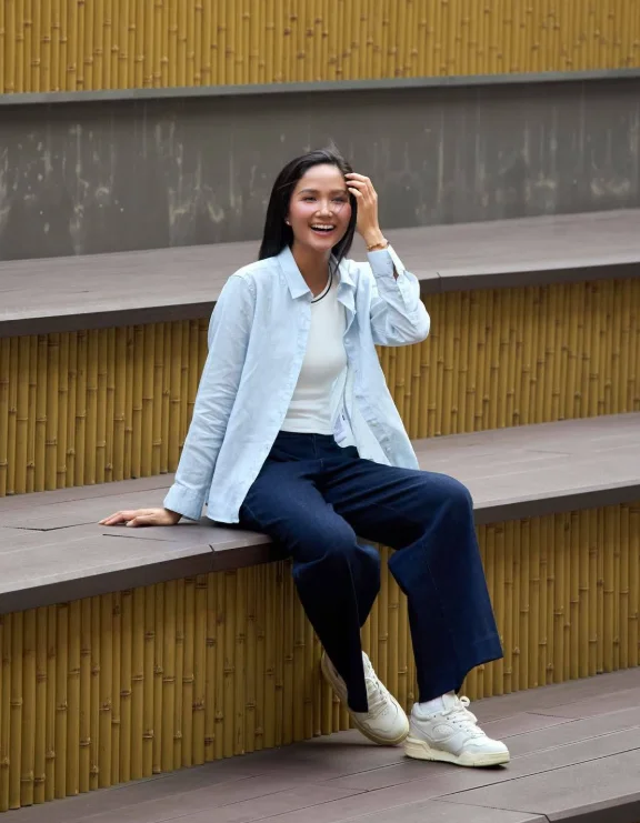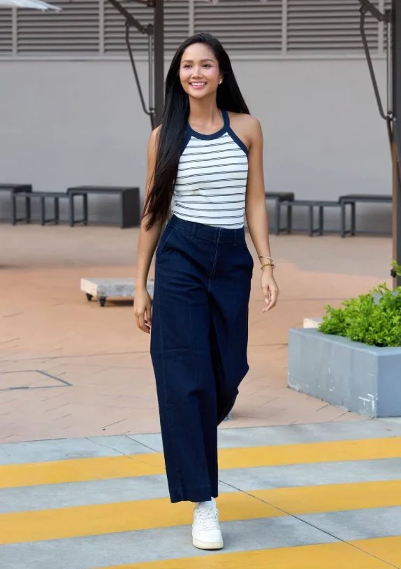 Một trong những “bài tủ” được H’Hen Niê thường xuyên áp dụng là kết hợp áo dáng gọn (tank top, áo ôm, áo hai dây) hoặc sơ mi/ cardigan mỏng cùng quần jean ống rộng cạp cao. Kiểu phối này tạo hiệu ứng eo nhỏ – chân dài, khiến vóc dáng thêm cân đối, đồng thời vẫn đảm bảo độ thoải mái cho những ngày phải di chuyển liên tục, đi quay, đi sự kiện hoặc hoạt động cộng đồng.