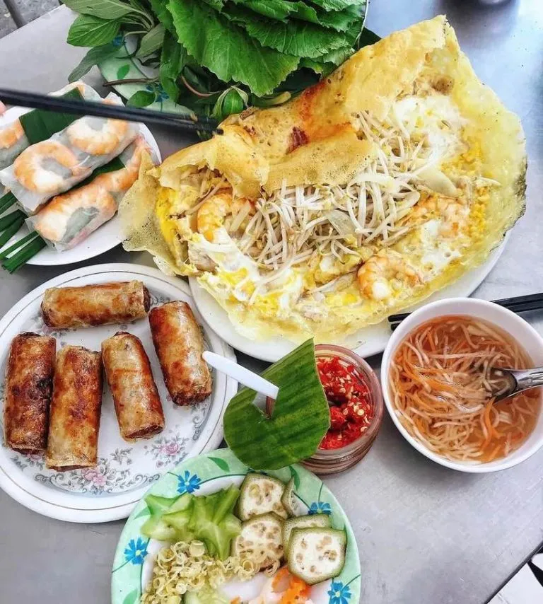 Chiếc bánh nhỏ gọn, tròn và mỏng, vừa tay đúng phong cách Bình Định. Vỏ bánh giòn xốp, “đứt” gọn khi cắn; tôm tươi để nguyên con trên mặt bánh nhìn cực bắt mắt. Nước chấm pha “chuẩn vị”, không quá ngọt, khiến miếng cuốn nào cũng vào gu. Không gian bình dân, mát mẻ; đi nhanh một bữa chiều tối là hợp lý nhất.
