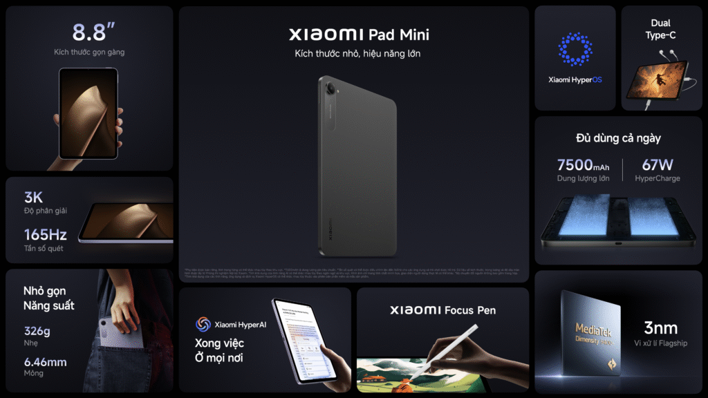 Cùng dịp, Xiaomi giới thiệu Xiaomi Pad Mini (thiết kế kim loại nguyên khối, dày 6,46 mm, nặng 326 g, màn hình 8,8″ 3K 165Hz – 700 nits; Dimensity 9400+; pin 7.500mAh, sạc 67W; hỗ trợ Xiaomi Focus Pen; tích hợp Xiaomi HyperAI với AI Writing/Interpreter/Art/Calculator và Google Gemini).